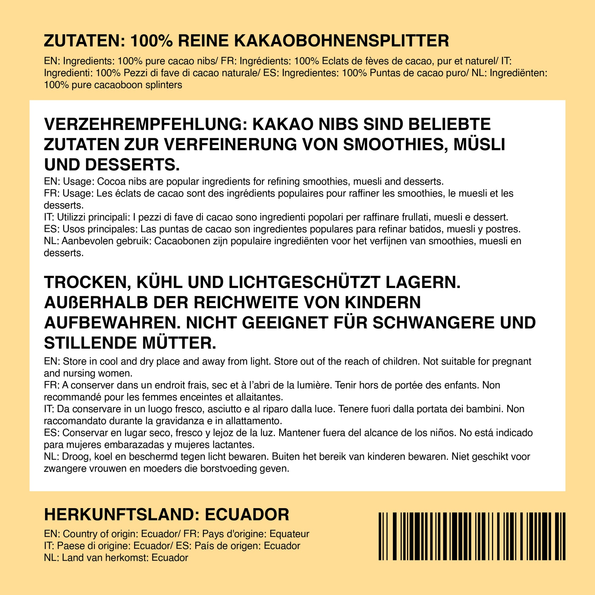 Cacao nibs are popular as a snack and easy to incorporate into a variety of sweet and savory recipes. They are a great addition to smoothies, granola, hot chocolate, yogurt, energy balls, and cakes.