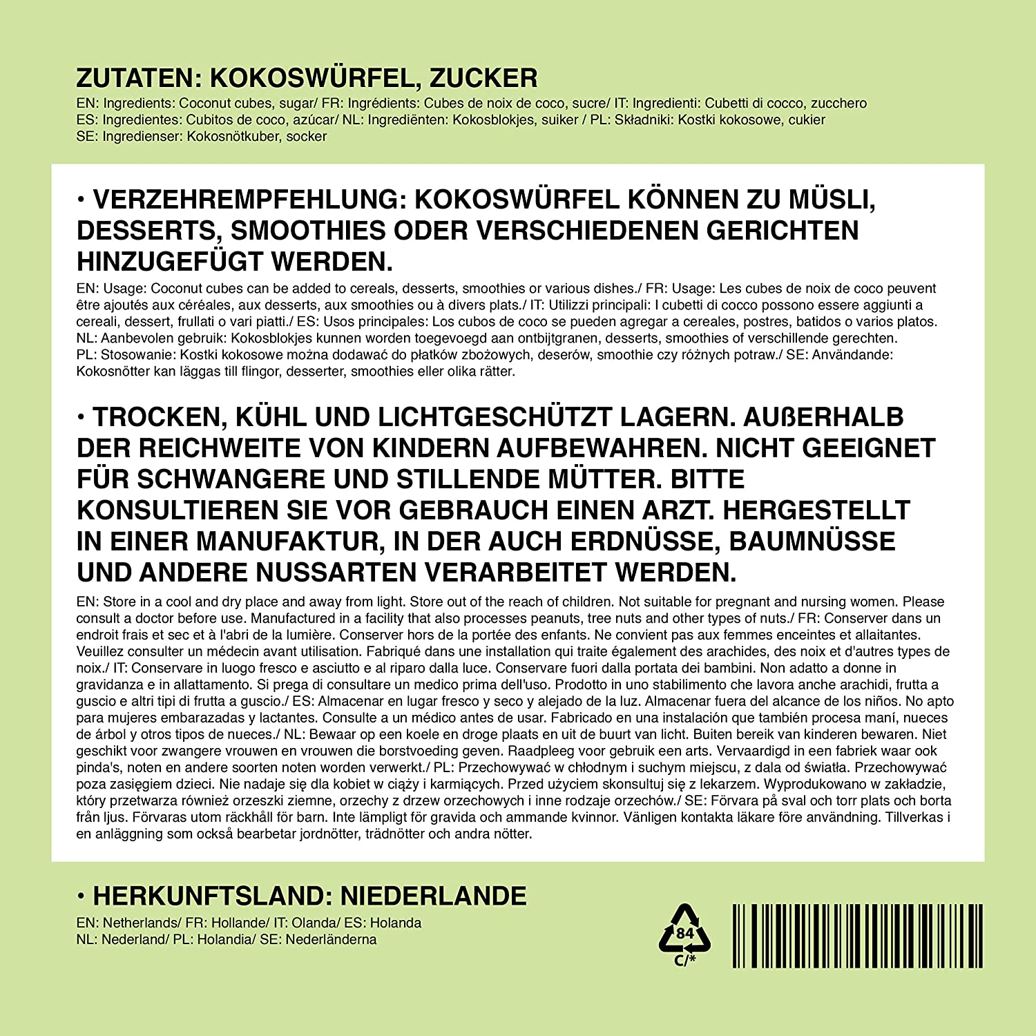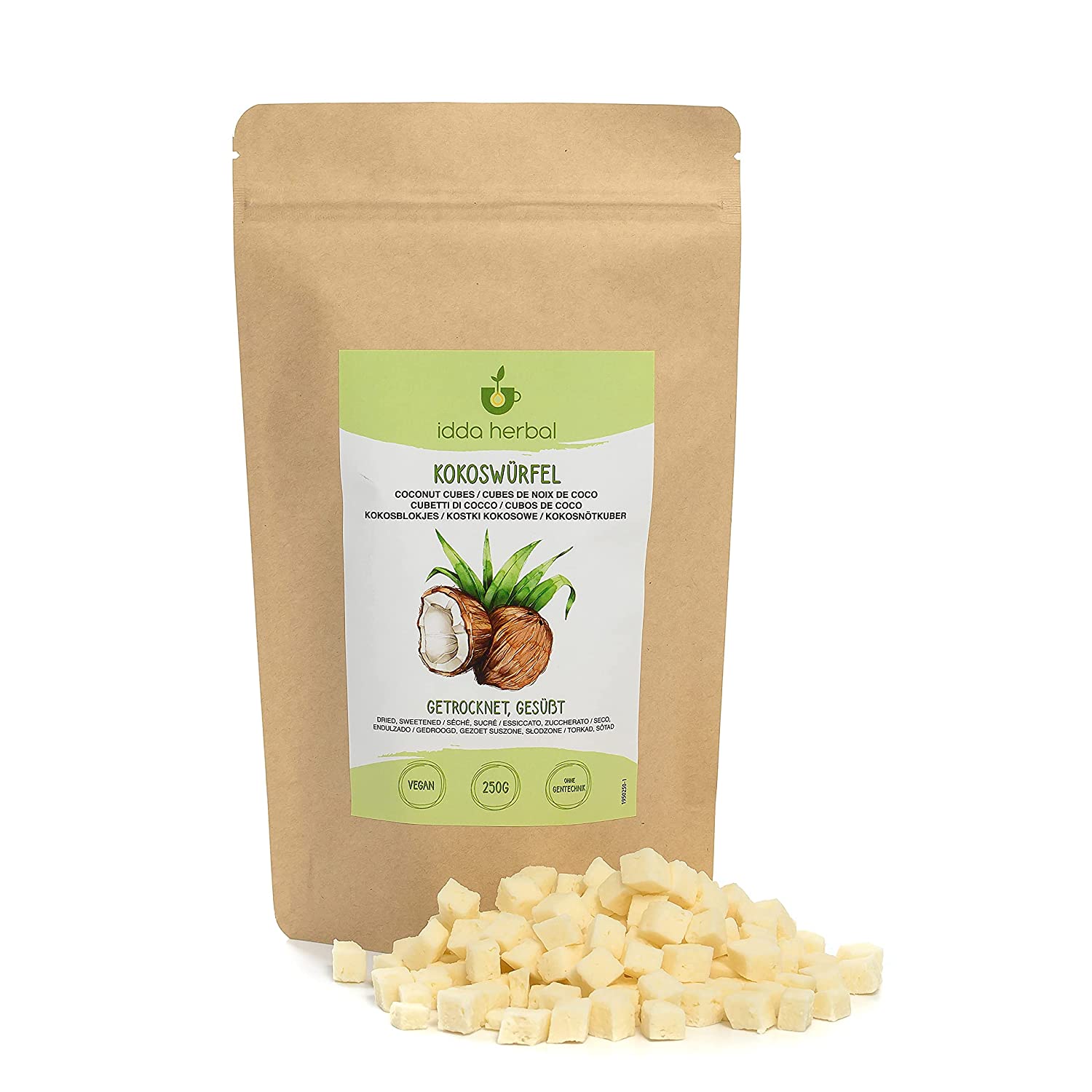 Coconut cubes have a soft and crunchy texture that melts in your mouth. Coconut palms grow in tropical coastal areas. The tree is considered one of the most useful trees in the world and is known as the tree of life in some nations. This is one of the few plants whose name does not come from Latin but from the old Portuguese word "coco", which means head or skull, because of the shape of the coconut and the three bulges it has.