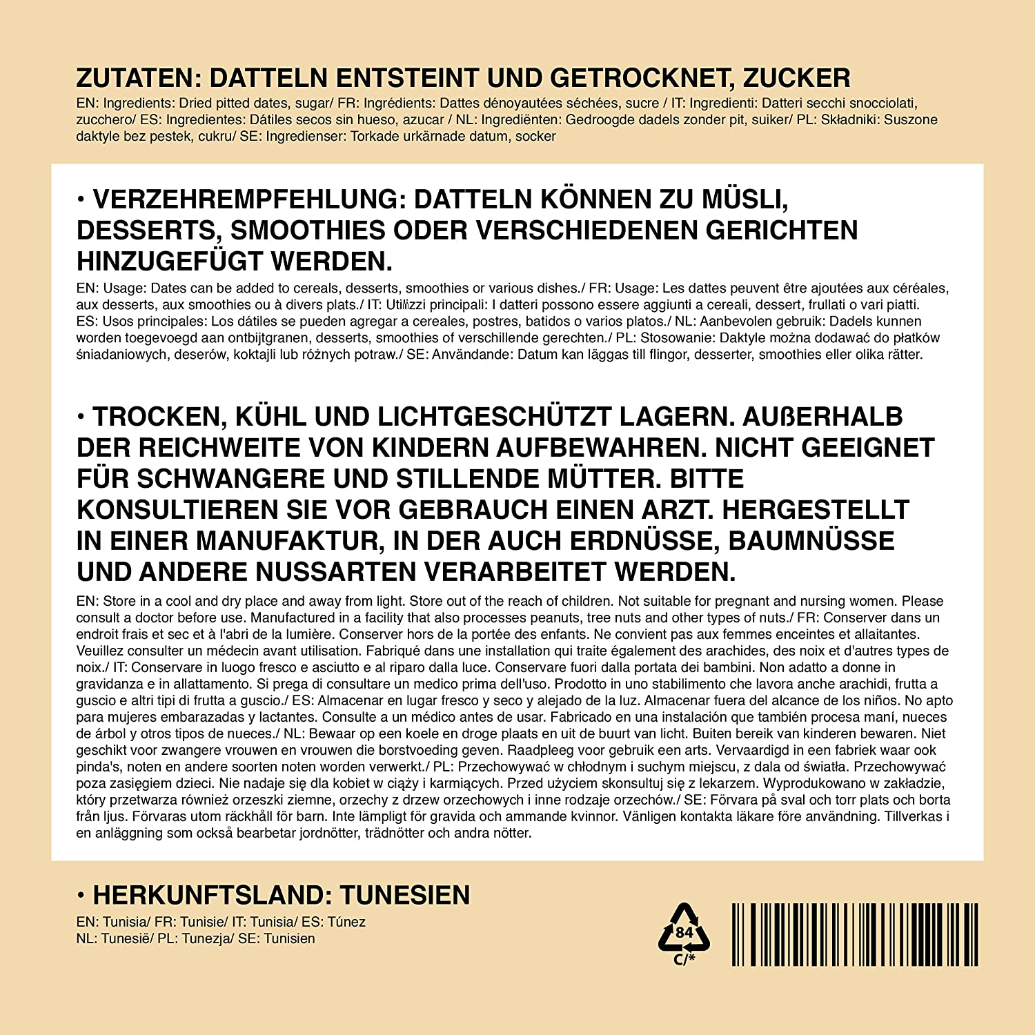 Dates are the sweet fruit of the date palm. They are typical of the Mediterranean Sea and Western Asia, places with tropical climates. Pitted dates are soft and chewy dried fruits with a sweet flavor and pleasant to eat straight away.