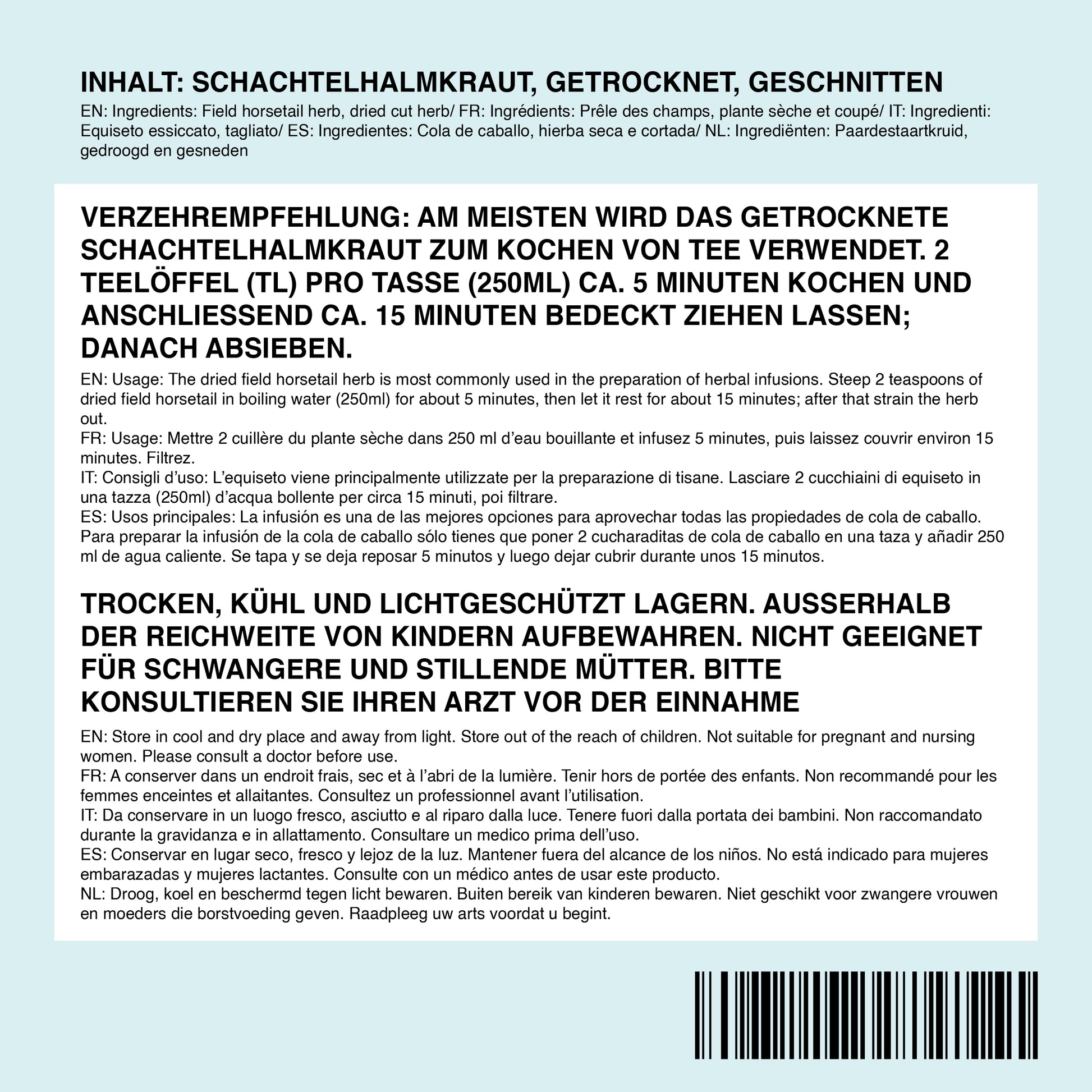 Dried and cut horsetail herb is most commonly used to make tea. Pour boiling water over 2 teaspoons per cup (250 ml) and let it steep for about 10-15 minutes, depending on taste.
