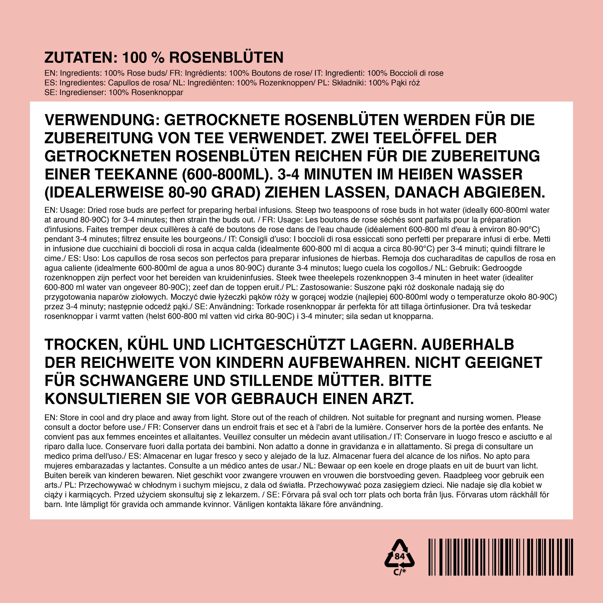 Dried rosebuds are perfect for making an aromatic tea. Two teaspoons are enough to prepare a teapot (600-800ml). Let sit in hot water (ideally between 80 and 90 degrees) for 3-4 minutes, then drain. The flowers can be used multiple times as long as they spread their wonderful scent.