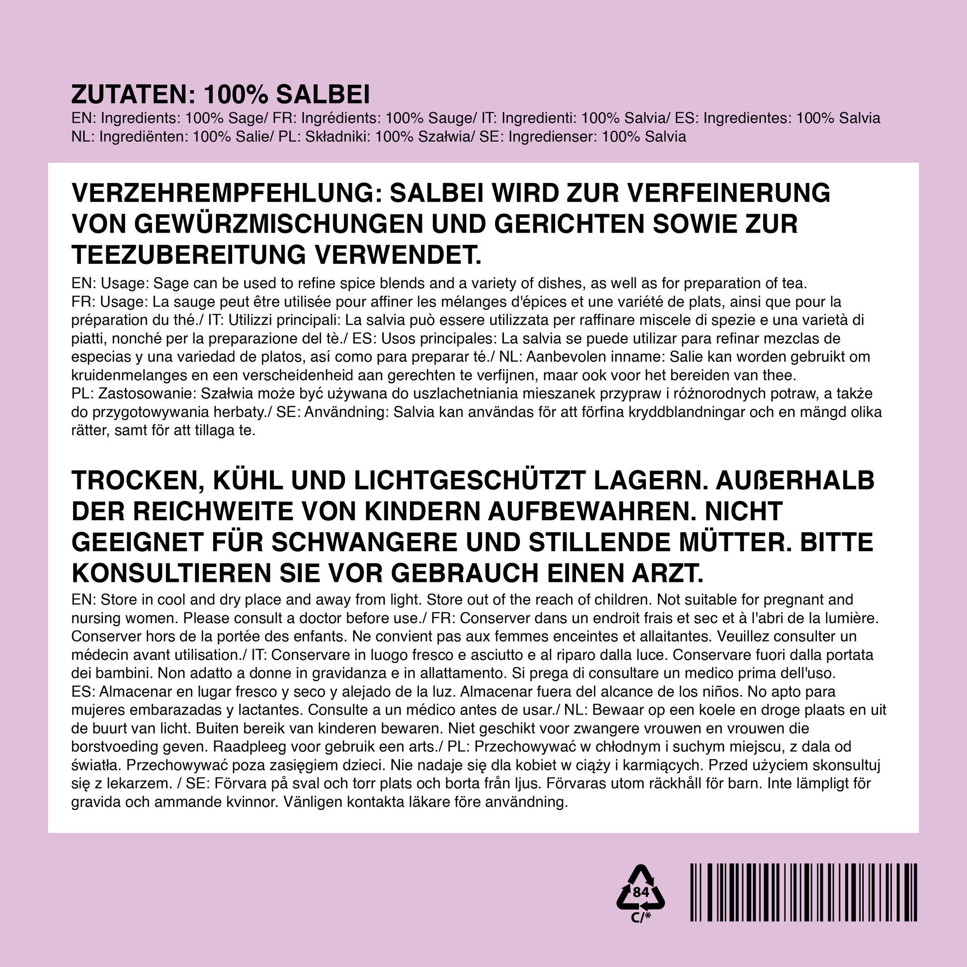 Sage, also known as salvia, belongs to the mint family. Originally from the Mediterranean region, it has been consumed there for thousands of years. This is one of the most commonly used herbs. The word salvia derives from the Latin word "salvāre" which means to save or to heal.
